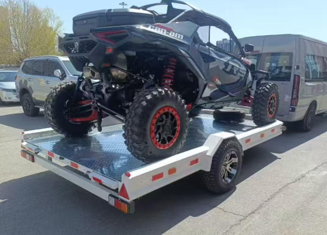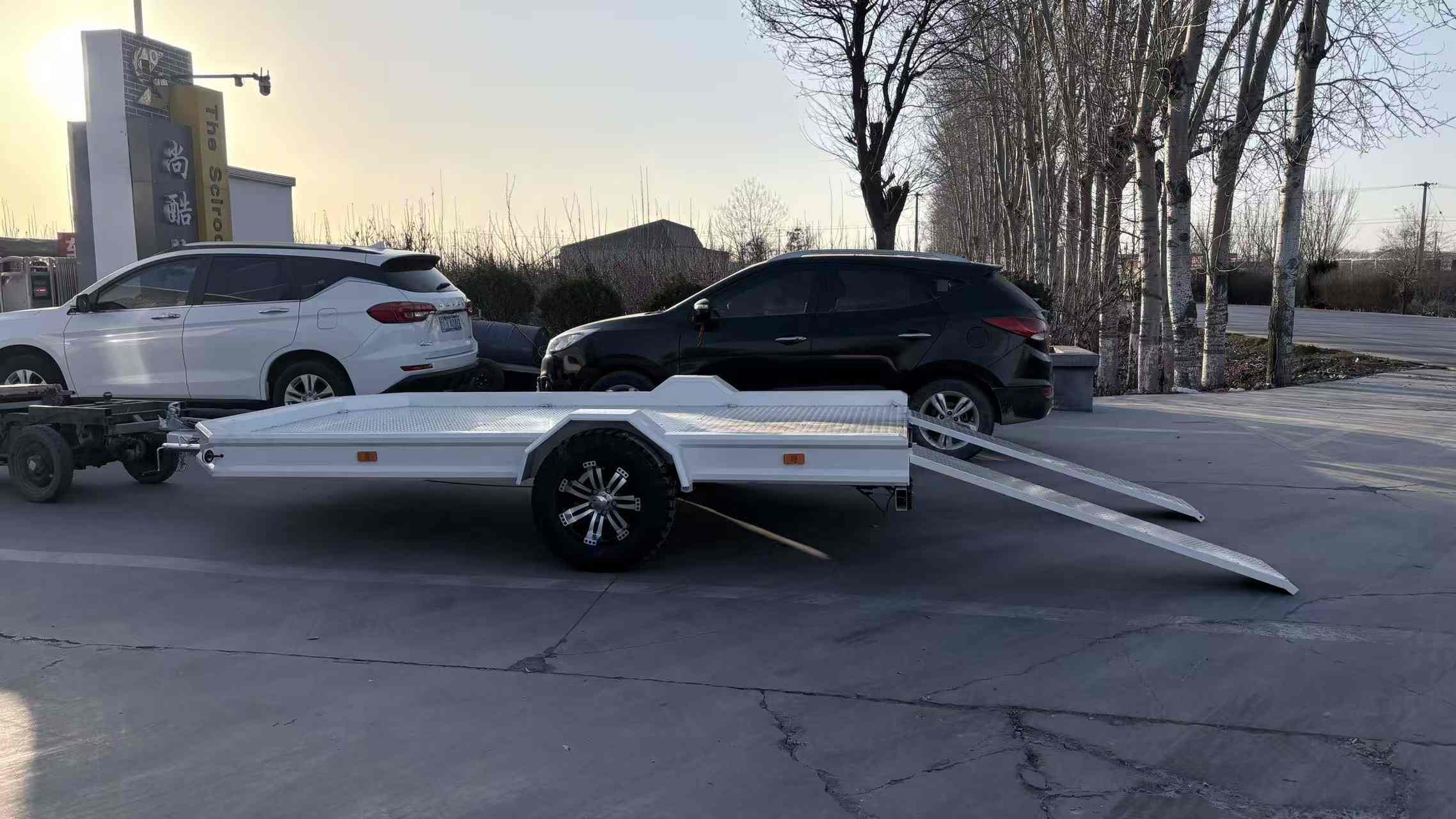 Het vlakke dek is gemaakt van antislip aluminiumplaat (of duurzame staalplaat) en biedt een oppervlak met hoge tractie om te voorkomen dat de lading tijdens het transport verschuift. De aluminium dekoptie is lichtgewicht en corrosiebestendig, ideaal voor gebruik buitenshuis in natte omgevingen of aan de kust, terwijl het stalen dek maximale duurzaamheid biedt bij zware, schurende belastingen. Het onopvallende ontwerp en de geïntegreerde oprijplaten maken het laden van ATV's, UTV's en kleine apparatuur snel en moeiteloos.